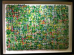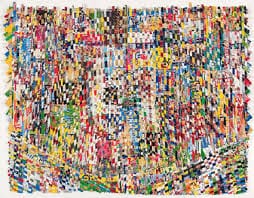 Cincinnati, Ohio artist Jonpaul Smith takes found paper–often related to consumer products like cereal boxes and candy wrappers–and weaves them into wacky tapestry-like work. He does this work by using very little glue. I am so curious to see this work in person.